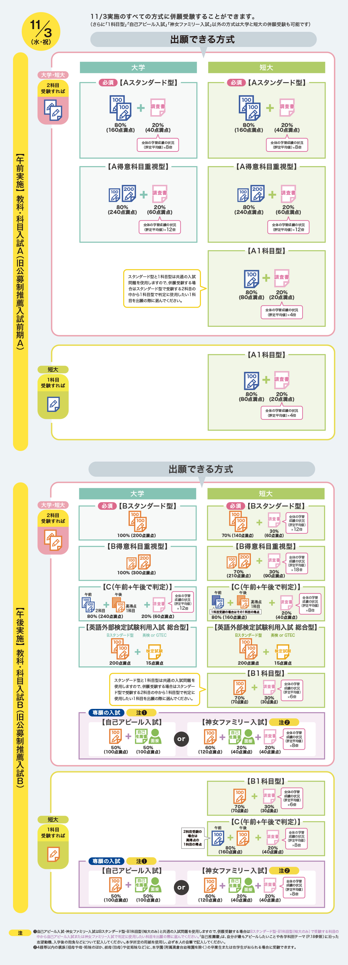 ・方式ごとに学科を変えて併願受験することも可能です。その際は、各学科が指定する科目の範囲内であることが条件です。
